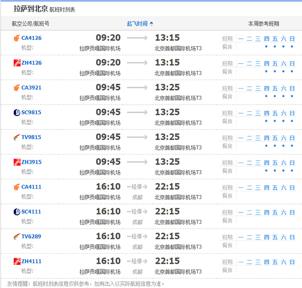 以上就是拉薩飛北京的航班時刻表,起飛時間,到達時間,及固定航班日期。